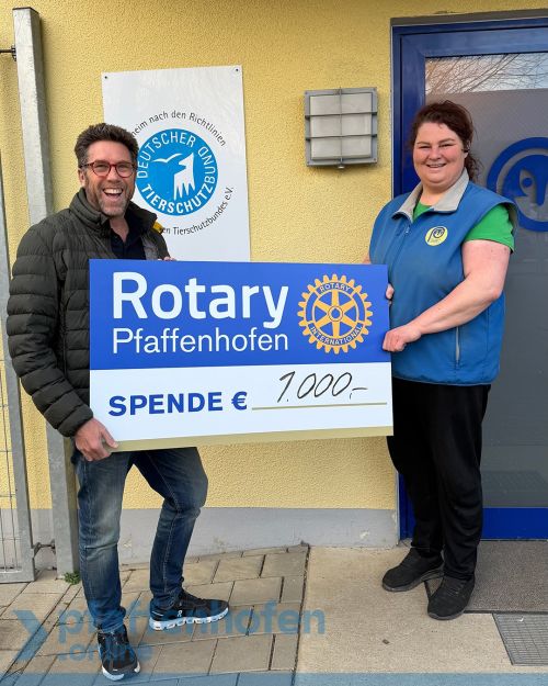 Pfaffenhofen a. d. Ilm. Rotary Pfaffenhofen hat den Tierschutzverein Pfaffenhofen mit einer Spende in Höhe von 1.000 Euro unterstützt. Den symbolischen Spendenscheck übergab Clubpräsident Dr. Christian Leitner an Petra...