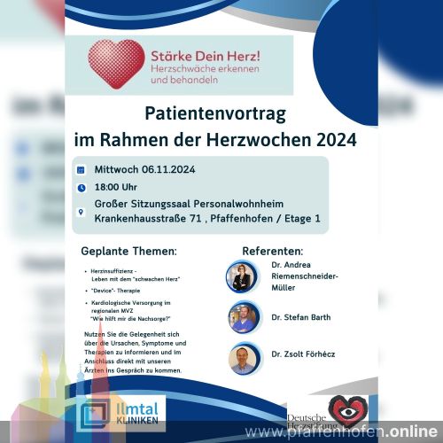Pfaffenhofen, 23.10. Oktober 2024 – Im Rahmen der diesjährigen Herzwochen 2024 lädt die Deutsche Herzstiftung in Kooperation mit den Ilmtalkliniken am Mittwoch, den 6....