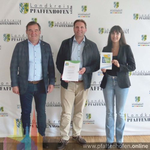 Die Plöckl Media Group aus Pfaffenhofen setzt ihr Engagement imUmwelt- und Klimapakt Bayern fort. Landrat Albert Gürtner (li.) undAbteilungsleiterin Katharina Baschab vom Landratsamt (re.)überreichten Geschäftsführer Roman Plöckl (Mitte)...