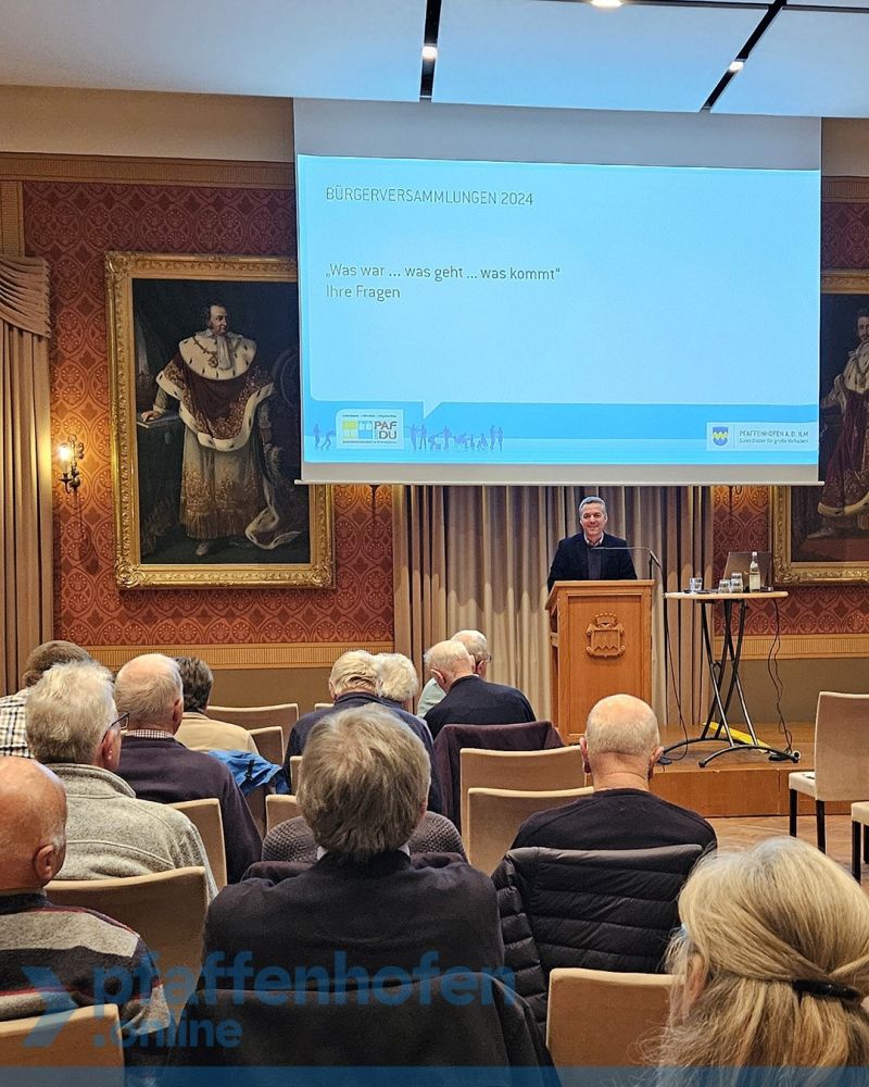 Für alle Bürgerinnen und Bürger des Stadtgebiets Pfaffenhofen sowie der Ortsteile Eberstetten, Förnbach, Fürholzen, Heißmanning, Menzenbach, Menzenpriel, Niederscheyern, Seugen, Schabenberg, Siebenecken, Sulzbach, Streitdorf, Weihern und Wolfsberg findet die Bürgerversammlung um 19.30 Uhr im Festsaal des Rathauses in Pfaffenhofen statt. Diese Versammlung wird zudem online auf