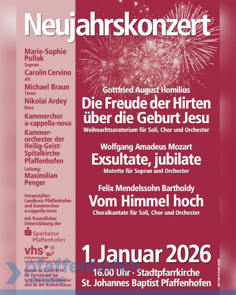 Mit seinem traditionellen Neujahrskonzert am 1. Januar 2026, 16 Uhr in der Stadtpfarrkirche St. Johannes Baptist in Pfaffenhofen, eröffnet der Landkreis Pfaffenhofen das musikalische Jahr. Unter der Leitung von Maximilian Penger treten der Kammerchor a-cappella-nova und das Kammerorchester der Heilig-Geist-Spitalkirche Pfaffenhofen gemeinsam mit einem hochrangigen Solistenquartett auf. Mit Marie-Sophie Pollak, Carolin Cervino, Michael Braun und Nikolai Ardey stehen vier Sängerinnen und Sänger auf der Bühne, die für stilistisch sichere und ausdrucksstarke Interpretationen bürgen. Die Sopranistin Marie-Sophie Pollak ist auf europäischen Bühnen ebenso präsent wie im Konzertfach. Sie ist für ihre klare, leuchtende Höhe und ihre besondere Affinität zur Musik des achtzehnten Jahrhunderts bekannt. Häufig in der Hamburger Elbphilharmonie zu hören, verbindet sie eine regelmäßige Zusammenarbeit mit Dirigenten wie Kent Nagano oder Ivor Bolton und Konzertauftritte mit Ensembles wie dem Freiburger Barockorchester, der Akademie für Alte Musik Berlin oder Les Violons du Roy. Im September ist Marie-Sophie Pollak erste große Solo-CD dem Barockorchester Concerto Köln und erschienen. Die Altistin Carolin Cervino widmet sich seit vielen Jahren dem Konzertrepertoire zwischen Barock und Romantik. Ihr warm timbrierter Mezzosopran verleiht den pastoralen und lyrischen Momenten des Abends besondere Tiefe. Der Tenor Michael Braun ist als Evangelist und Solist in Oratorien gefragt und verbindet textliche Klarheit mit präziser Linienführung. Der Bass Nikolai Ardey ergänzt das Ensemble mit einer kraftvollen, zugleich nuancierten Stimme, die sowohl dramatische als auch ruhige Passagen souverän trägt. Den Beginn macht Gottfried August Homilius’ Weihnachtsoratorium „Die Freude der Hirten über die Geburt Jesu“. Homilius, ein bedeutender Kirchenkomponist im Umfeld der Dresdner Hofkirche, schrieb das Werk 1777. Es kombiniert lebendige Chorszenen, erzählende Rezitative und strahlende Arien und zeichnet die Weihnachtsgeschichte in einer für die Zeit bemerkenswert ausdrucksnahen Tonsprache. Die Musik bewegt sich zwischen barocker Festlichkeit und dem empfindsamen Stil der Frühklassik und vermittelt damit sowohl Geborgenheit als auch festliche Freude. Mozarts Motette „Exsultate, jubilate“ führt in eine andere Klangwelt. Sie entstand 1773 während eines Mailänder Opernaufenthalts und war für einen gefeierten Kastraten bestimmt. Entsprechend virtuos ist die Sopranpartie angelegt, die mit brillanten Koloraturen, weiten Intervallsprüngen und einem jubelnden „Alleluia“ endet. Das Werk gilt als eine der frühesten Kompositionen Mozarts, in der sich seine unverwechselbare melodische Eleganz bereits voll entfaltet. Felix Mendelssohn Bartholdys mächtige Choralkantate „Vom Himmel hoch“, komponiert 1831, bildet den dritten Programmpunkt. Mendelssohn, der sich intensiv mit der Kirchenmusik Johann Sebastian Bachs auseinandersetzte, greift das bekannte Weihnachtslied Martin Luthers auf und entwickelt daraus eine neue romantische Klangarchitektur. Der fünfstimmige Chor, die beiden Solopartien und das Orchester verschmelzen zu einem atmosphärischen Gesamtbild, das den traditionellen Choral in ein
