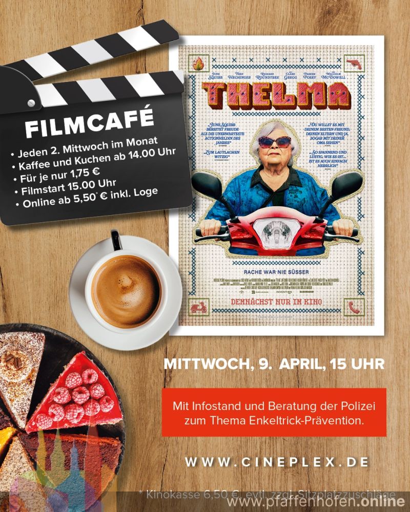 Am Mittwoch, den 9. April, lädt das Cineplex Pfaffenhofen wieder zum beliebten FilmCafé ein und präsentiert die charmante Krimikomödie „Thelma“. Neben Kaffee und Kuchen ab 14 Uhr erwartet die Besucherinnen und Besucher ein ganz besonderes Programm: Vor der Filmvorführung klären Beamte der Polizei über die Gefahren von Telefonbetrug und den sogenannten „Enkeltrick“ im Foyer auf.
