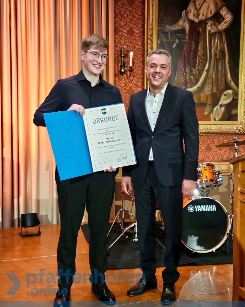 Die Stadt Pfaffenhofen hat gestern Abend im Festsaal des Rathauses den 29. Kulturförderpreis an den 19-jährigen Musiker Quirin Meinersmann verliehen. Meinersmann war viele Jahre Schüler der Städtischen Musikschule Pfaffenhofen und spielt Akkordeon, Posaune und Klavier. Der mit 1.500 Euro dotierte Preis würdigt junge Talente und besonderes kulturelles Engagement; er wird seit 1993 vergeben und entstand auf Anregung von Musikreferent Max Penger.