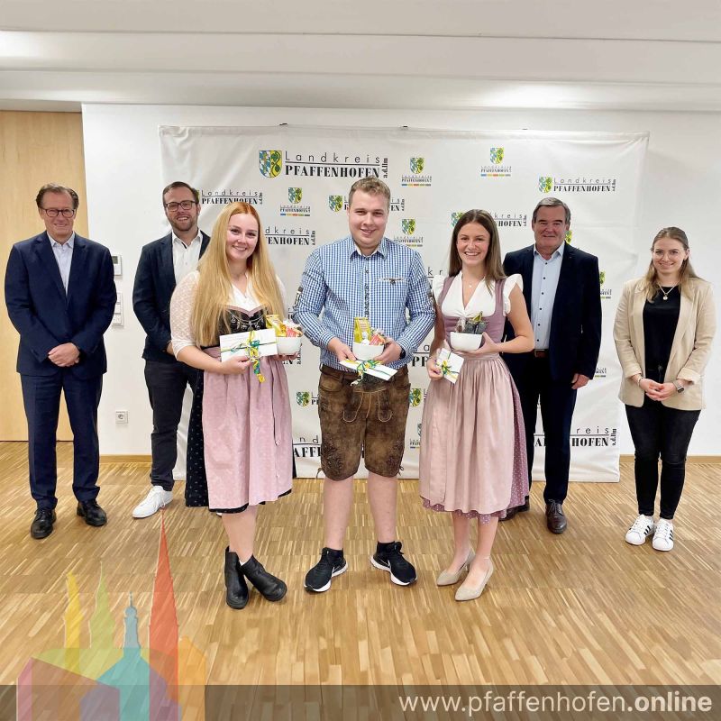 Grund zum Feiern gab es jetzt für drei Auszubildende am Landratsamt Pfaffenhofen. Sie schlossen mit durchwegs guten Prüfungsergebnissen ihre Ausbildung zur/zum Verwaltungsfachangestellten ab. Landrat Albert Gürtner gratulierte Johanna Bedon, Magdalena Vogl und Fabian Fliegel dazu sehr herzlich. Für sie endet damit eine dreijährige Ausbildungszeit, in der sie sowohl in der praktischen Ausbildung beim Landratsamt als auch bei der Bayerischen Verwaltungsschule und der Berufsschule auf ihren Beruf vorbereitet wurden.