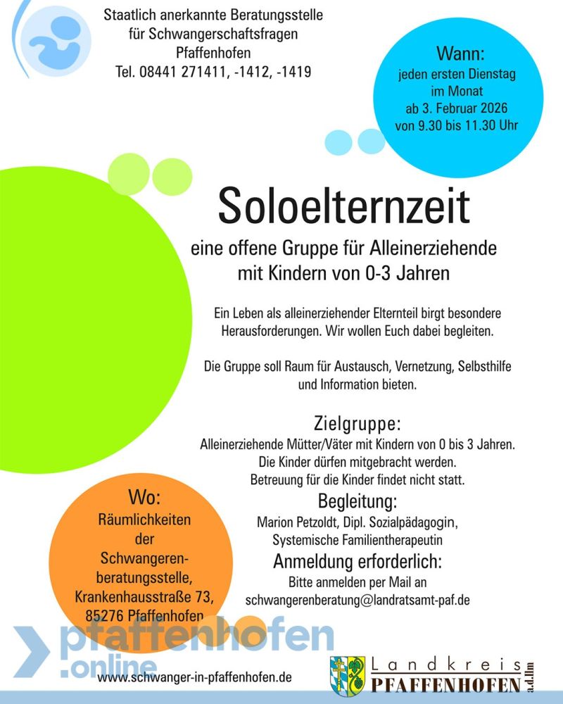 Die staatlich anerkannte Beratungsstelle für Schwangerschaftsfragen Pfaffenhofen lädt am Dienstag, 3. Februar, zum Auftakttermin des neuen Gruppenangebots „Soloelternzeit“ ein. Die Gruppe richtet sich an Alleinerziehende mit Kindern im Alter von 0 bis 3 Jahren und findet künftig jeden ersten Dienstag im Monat in den Räumen der Schwangerenberatung in der Krankenhausstraße 73 statt. Mit dem neuen Angebot möchte die Beratungsstelle einen geschützten Raum schaffen, in dem sich Alleinerziehende