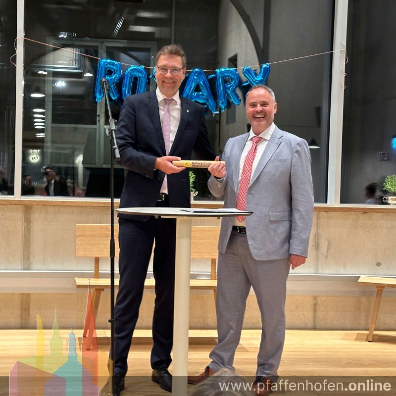 In weltweit über 33.000 Rotary Clubs wechseln die Präsidenten satzungsgemäß im Juni. Am vergangenem Samstag ging der Präsidentenstab des hiesigen Rotary Clubs Pfaffenhofen/Ilm von Matthias Schäfer auf den Präsidenten des rotarischen Jahres 2024/2025, Hans Bergmeister über.